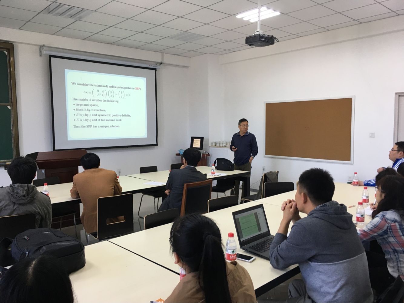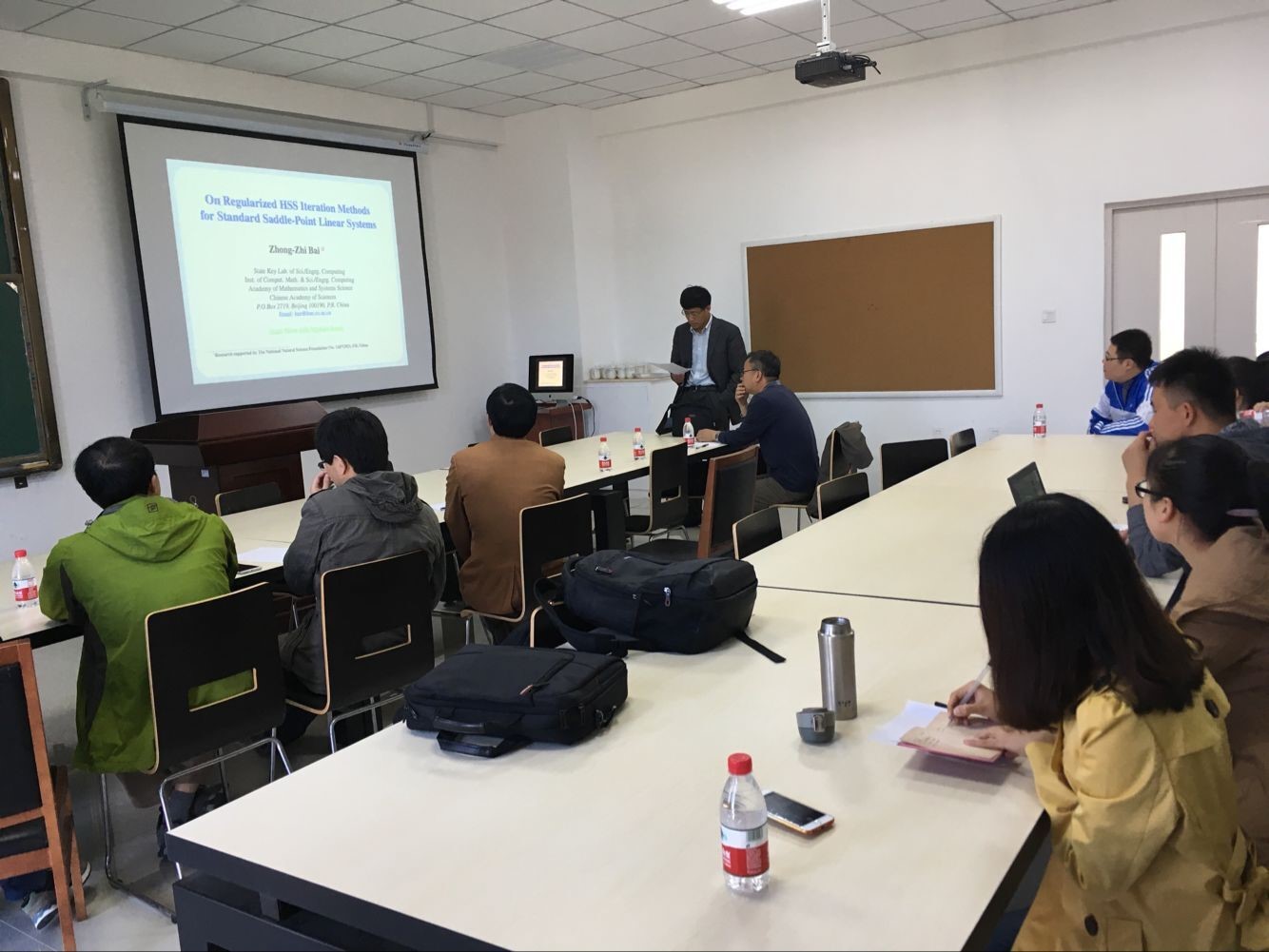 白中治研究员到访期间,就数值代数前沿课题和基础教学部青年教师深入探讨。并于5月6日为青年教师和研究生做了题为“On Regularized HSS Iteration Method for Saddle-Point Linear Systems”的学术报告,引起参会师生的热烈讨论。白中治研究员还对基础教学部学科建设、人才梯队建设以及将来的专业建设提出很多中肯的建议。